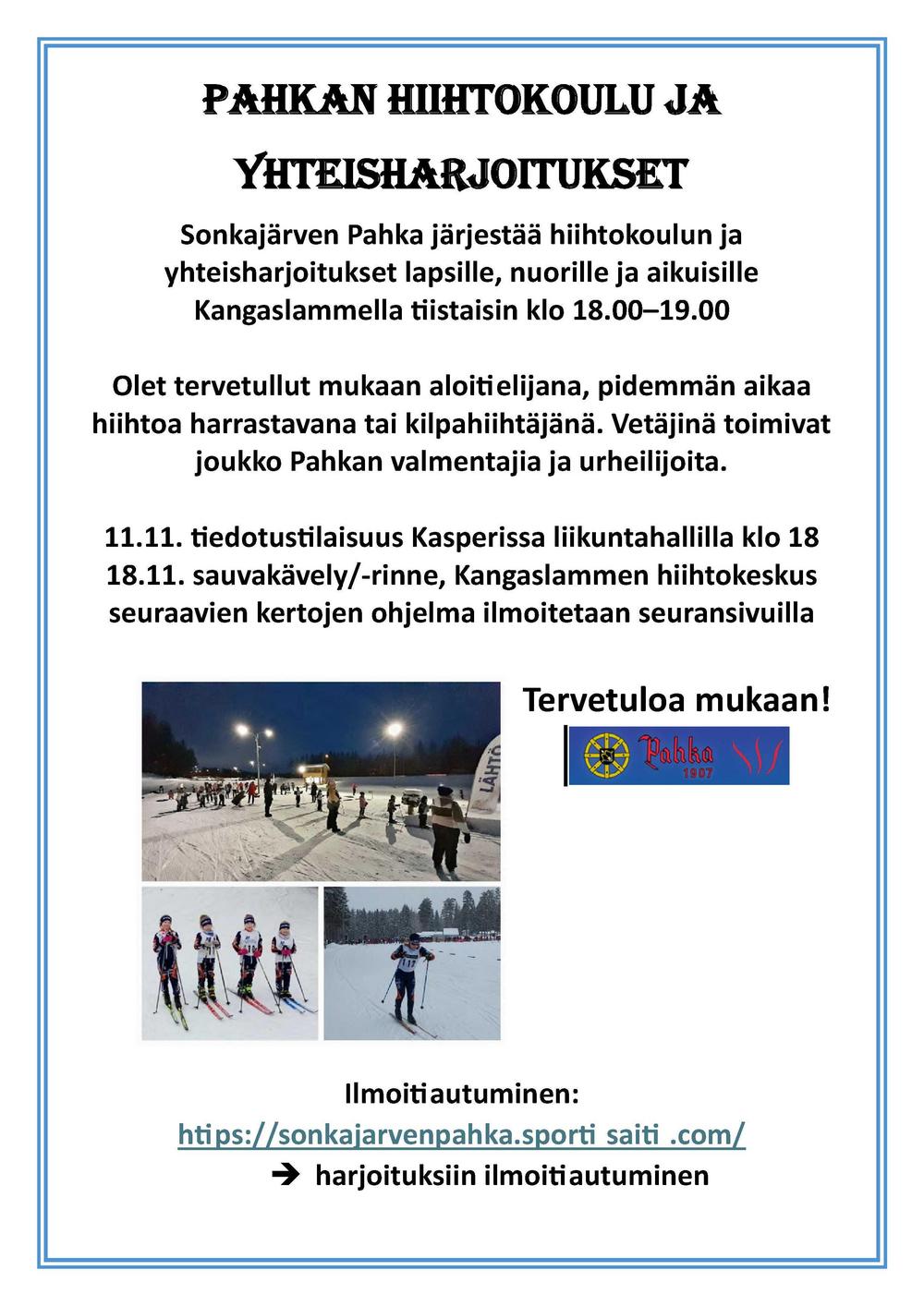 Pahkan hiihtokoulu ja yhteisharjoitukset aloitetaan tiedotustilaisuudella Kasperissa liikuntahallilla 11.11.2025 klo 18. Hiihtokoulu ja yhteisharjoitukset pidetään Kangaslammin hiihtokeskuksessa tiistaisin 18.11.2025 alkaen.